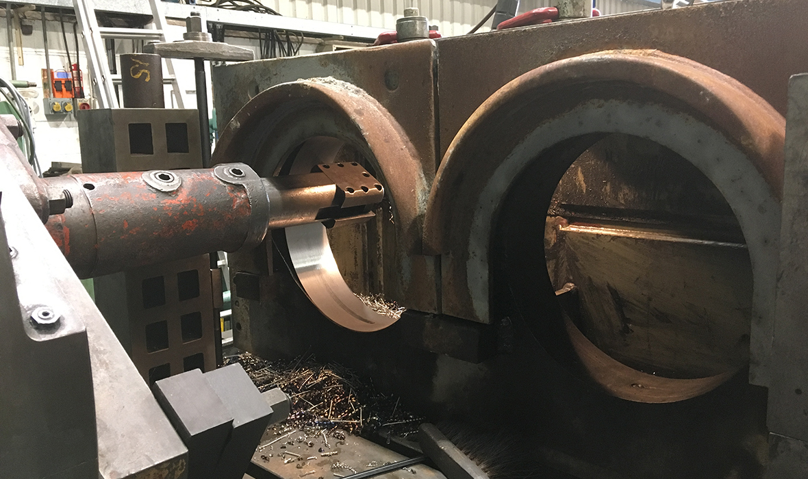 The replacement for the scrapped item was made to suit the centre distance and modified to limit the backlash that would be caused by wearing it in with its mate. The whole interface between the output shaft and the crusher was badly worn, requiring re-boring (shown in images 4 and 5) and new oversize bearing cassettes to the driven end of the crusher frame.”